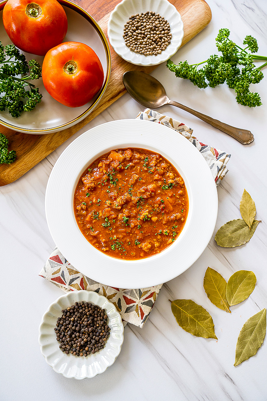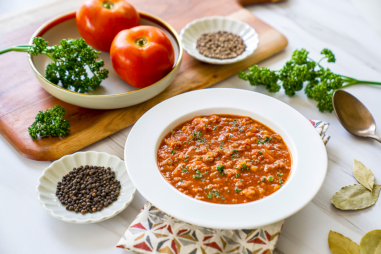 新鮮健康美味100分!特選後腿豬肉與大量新鮮番茄、杏鮑菇、秀珍菇、紅蘿蔔、洋蔥、西芹,以羅勒和義大利辛香料拌炒增添香氣,並使用紅酒慢火燉煮,酸度與甜味恰到好處,濃郁多汁的肉醬,完美呈現經典口味。